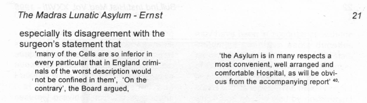 - “Whilst most Europeans were sent to institutions in their motherland, Eurasians and Indians almost always remained in the Madras asylum. Despite the periodic transfer of Europeans from 1821 onwards, the building soon became overcrowded.“